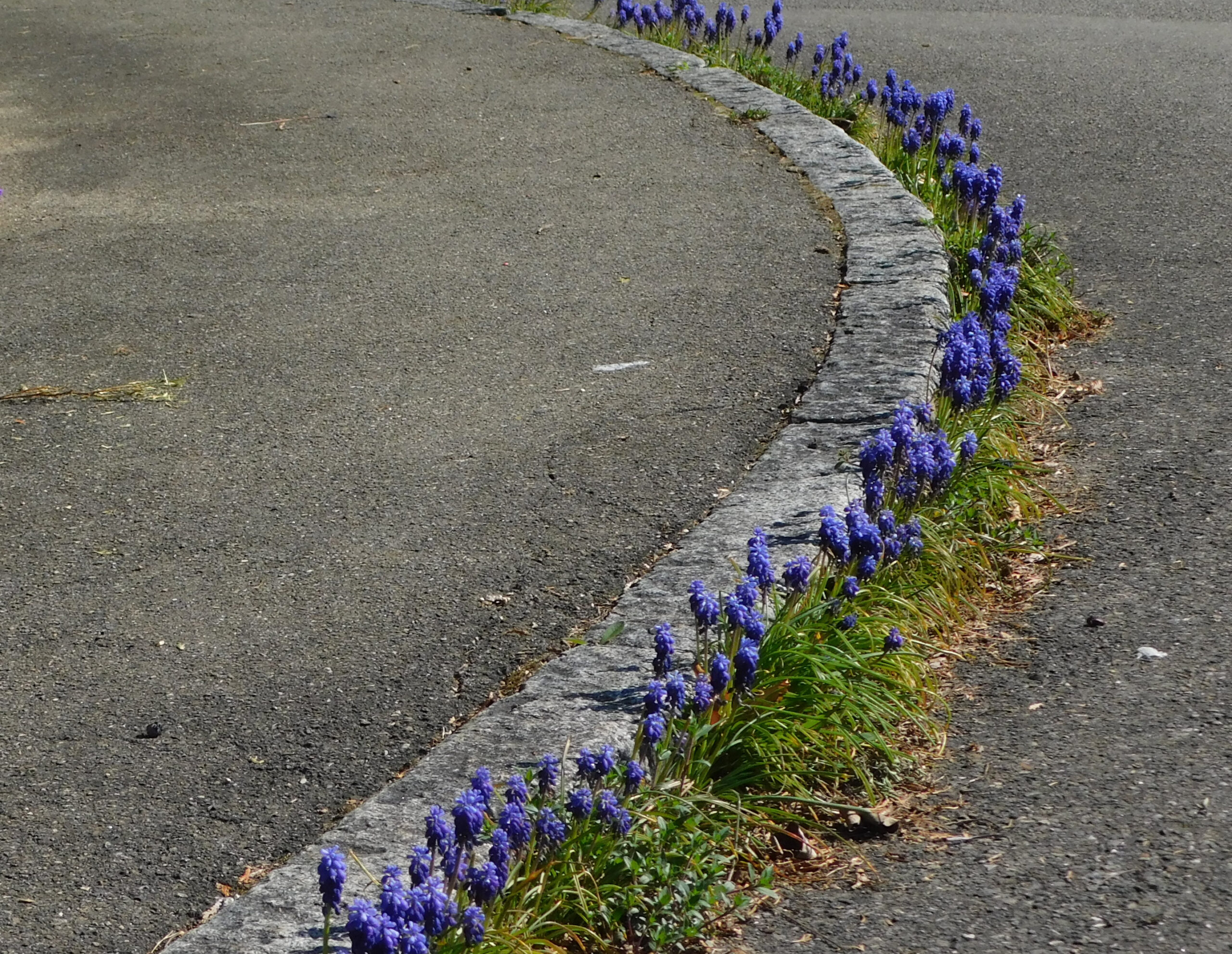 Auf den Touren mit meinem Handbike komme ich schon seit vielen Jahren an einer Bordsteinkante vorbei, die in jedem Frühjahr wunderbar geschmückt ist. Aus dem schmalen Spalt zwischen den Bordsteinen und dem Straßenasphalt wachsen in jedem Frühjahr unzählige Blütenstände der Traubenhyazinthe. Heute konnte ich mit der Bewohnerin des angrenzenden Grundstücks sprechen. Sie schont diesen schmalen Streifen ganz bewusst, hier wird nichts ausgekratzt.